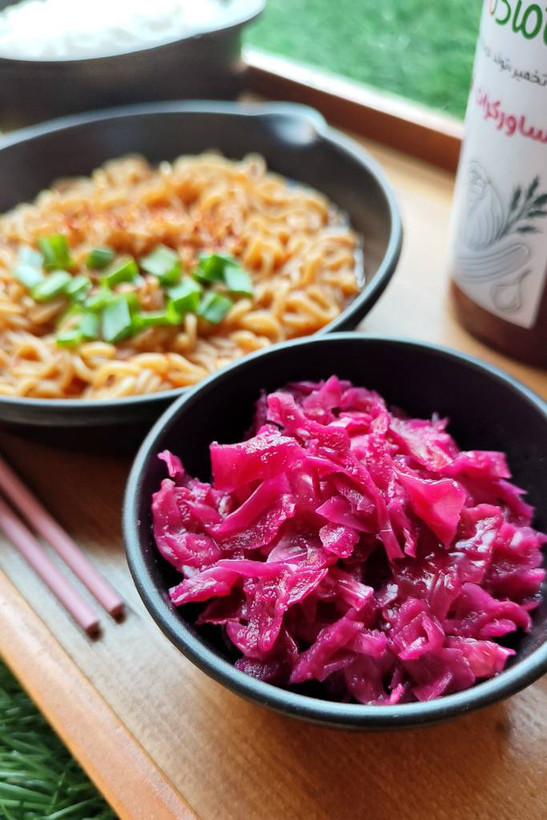 🟪ساورکرات قرمز(کلم ترش قرمز) یک محصول تخمیری و بدون سرکه است که از ترکیب کلم قرمز، سیب، زنجبیل و نمک بدون ید بدون هرگونه نگهدارنده و مواد افزودنی در کارگاه مواد غذایی کیم بیوتیک آماده شده است.
